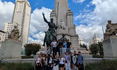 Am Mittag konnten wir noch ein wenig auf eigene Faust herumschlendern, doch um etwa zwei Uhr sammelte sich die Klasse wieder. Gemeinsam gingen wir zu Fuss zum Plaza de España, um die Statue zu betrachten, die die Protagonisten des berühmten Buches „Don Quijote“ sowie dessen Autor darstellte. Anschliessend ging es direkt zum Palacio Real, dem Königspalast, in dem früher die Königsfamilie lebte, der heute aber hauptsächlich für Staatszeremonien und Empfänge genutzt wird. Vor dem Palast erwartete uns bereits die nächste Aufgabe: ein kurzes Theater zu erfinden, das den Brand, der an Heiligabend 1734 die damalige Burg zerstörte und zum gänzlichen Neuaufbau des Palastes führte, thematisierte. Nach den Theaterstücken hatten wir die Gelegenheit, die prächtigen Innenräume des Palastes selbst zu besichtigen.