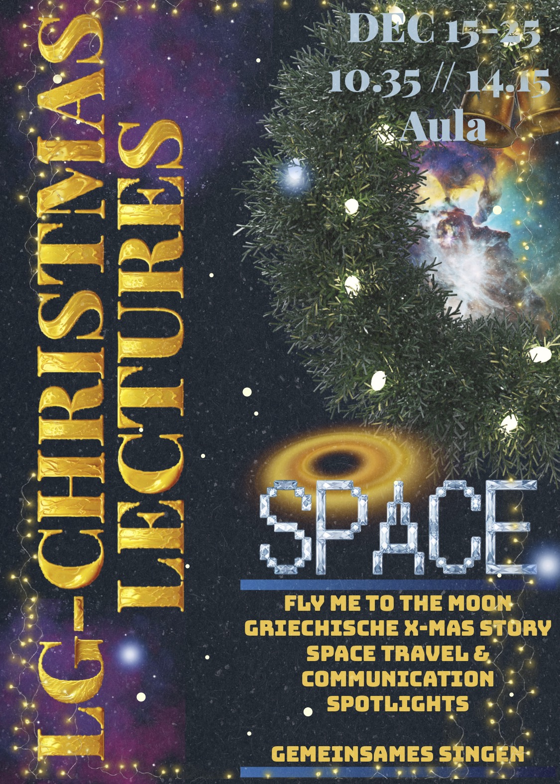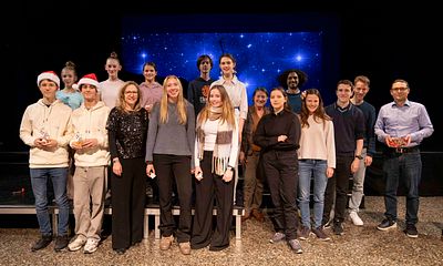 Am 15. Dezember fanden in der Aula erneut die LG-Christmas Lectures statt. Nebst einem kurzen Spotlight auf die Weihnachtsgeschichte (Griechisch), erklärte Félix Bommier (Matur 2025) in wenigen Minuten, wie man eine Flugbahn zum Saturnmond Enceladus berechnet und weshalb das im Sinne der Forschung interessant und relevant ist.