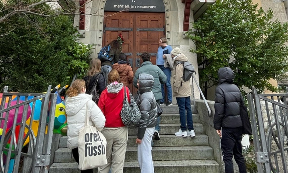 Following the interesting morning, we were ready to have some lunch. When we arrived at the „Blinde Kuh“, a kind lady who was blind greeted us and gave us a quick introduction. We had to leave everything that could possibly glow in the dark, outside. Afterwards, we split up into three groups, and had to grab onto each other‘s shoulders. Then, the waitress led us inside. It started off in a dim corridor so our eyes could adjust to the darkness. After a moment, we were guided into a pitch black „room“. There was no proof that it actually was a room, since we could not see anything at all. It did not matter whether your eyes were opened or closed, you could only see the darkness. Thus, we had to rely on our hearing and touch senses. We had to search for our plates and cutleries with our hands. Before getting our food, we tried to make out who was were, and after a while, some people even started „seeing things“.