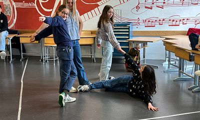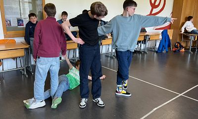 Als die Klasse dies erkannt hatte, konnten sie selbst Symmetrie erleben. Gegenseitig spielgelten sich die Schüler:innen, versuchten sich als Spiegelbild über die Symmetrieachse zu bewegen und erlebten was der Unterschied zwischen Punkt- und Achsensymmetrie ist.
